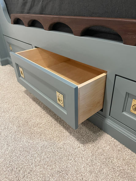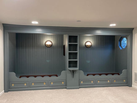 This two part bonus room project consisted of three twin-size elevated platforms with bottom drawers and cubbies and a fully functioning mini kitchen with a hidden microwave, trash can and undercabinet fridge.
